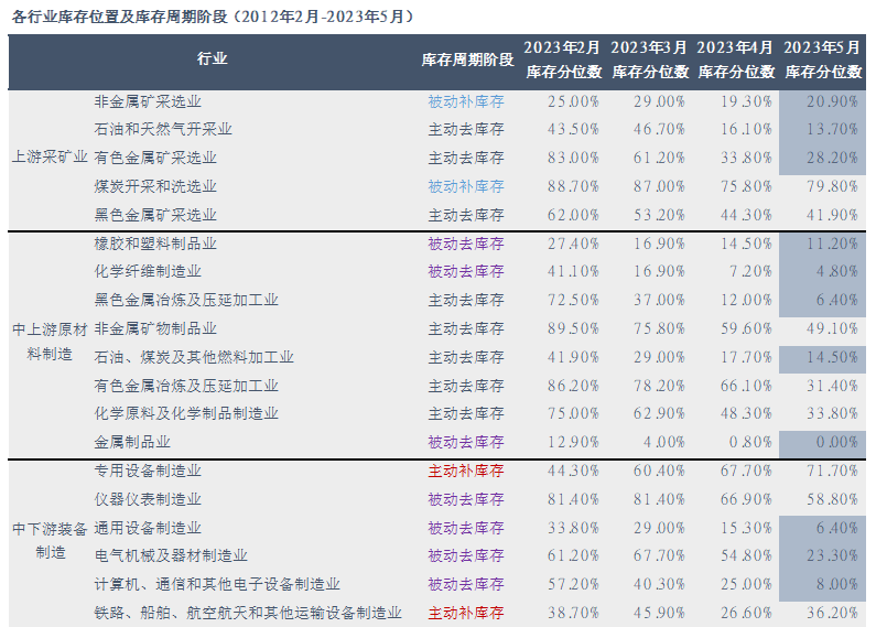 随着地产和基建对于需求的影响趋于减弱,在稳增长政策下库存见底才有望释放更多需求,库存周期拐点成为市场的关注焦点。从总量上看,本轮库存周期已逐步进入主动去库存阶段的尾声,正向被动去库存阶段转换,预计库存底部将出现在2023年四季度前后。主动去库存阶段的结束和被动去库存阶段的开启意味着企业盈利开始改善,经济开始进入上行区间,基本面有望迎来边际改善。从行业层面来看,目前上游采矿业和公用事业中的细分行业多数处于主动去库存阶段,库存去化压力较大。中上游原材料制造、中下游装备制造和下游消费制造的部分行业已逐步进入被动去库存阶段,少数细分行业甚至已经进入主动补库存阶段。建议重点关注中上游原材料制造、中下游装备制造和下游消费制造中库存去化程度较高、有望率先实现补库、盈利明显改善的细分方向。(1)中上游原材料制造:重点关注橡胶塑料和金属制品等行业;(2)中下游装备制造:重点关注通用设备、电气机械和计算机通信电子设备等行业;(3)下游消费制造:重点关注皮革制鞋、服装服饰、汽车制造、印刷和家具制造等行业。风险提示:资本市场波动风险、地缘政治风险、美国通胀超预期、经济复苏不及预期、国内政策超预期。