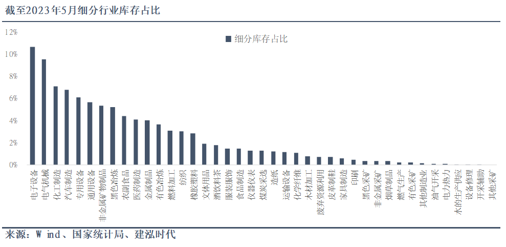 在以往的几轮库存周期中,实体经济需求的复苏主要依赖于地产和基建的发展推动,而目前的经济周期缺乏大的政策和总量上的刺激,因此行业层面的库存周期分析对于寻找细分行业的结构性机会显得十分重要。国家统计局将大类行业分为上游采矿业、中上游原材料制造、中下游装备制造、下游消费制造和公用事业等,不同行业所处的库存周期和盈利周期均有所区别。从库存构成来看,库存占比从高到低分别是中下游装备制造、中上游原材料和下游消费领域,截至2023年5月其库存占比分别为34.4%、32.5%和30.3%;而上游采矿业和公用事业的库存占比较低,分别仅为2.4%和0.4%。从细分行业看,库存占比靠前的行业主要是电子设备、电气机械、化工制造、汽车制造和专用设备,其库存占比分别为10.7%、9.5%、7.1%、6.8%和6.1%,CR5达40.2%,CR10达64.9%。木材加工、废弃资源利用、皮革制鞋、家具制造、印刷、黑色采矿、非金属采矿、烟草制品、燃气生产等行业库存占比较低,均低于1%,库存占比位列后20%的行业合计占比仅为9%。
