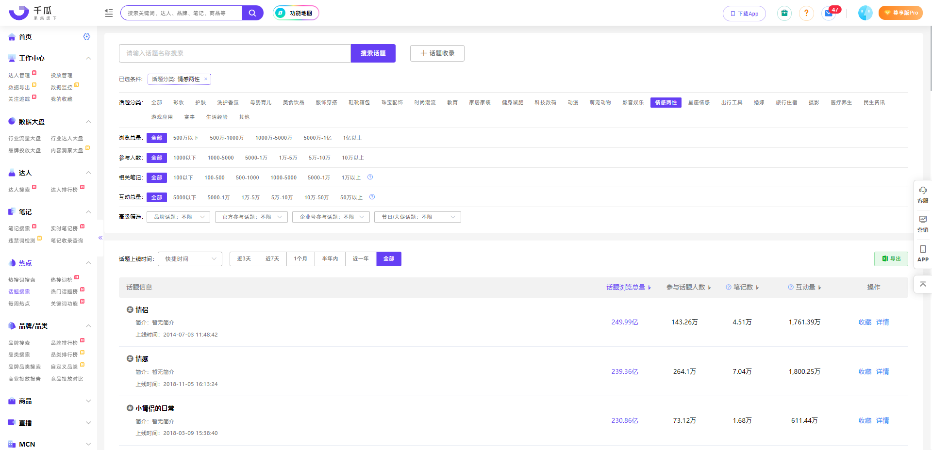 同时,我们还可以借助小红书热词、热门话题排行榜,来挖掘选题。例如,查看情感分类下的话题列表,“小情侣的日常、情感树洞、女性智慧、crush、异地恋、Girls Talk”等话题浏览量皆超过20亿,此类热度较高且符合当下关注趋势的话题,可纳入选题库进行详细的内容规划。