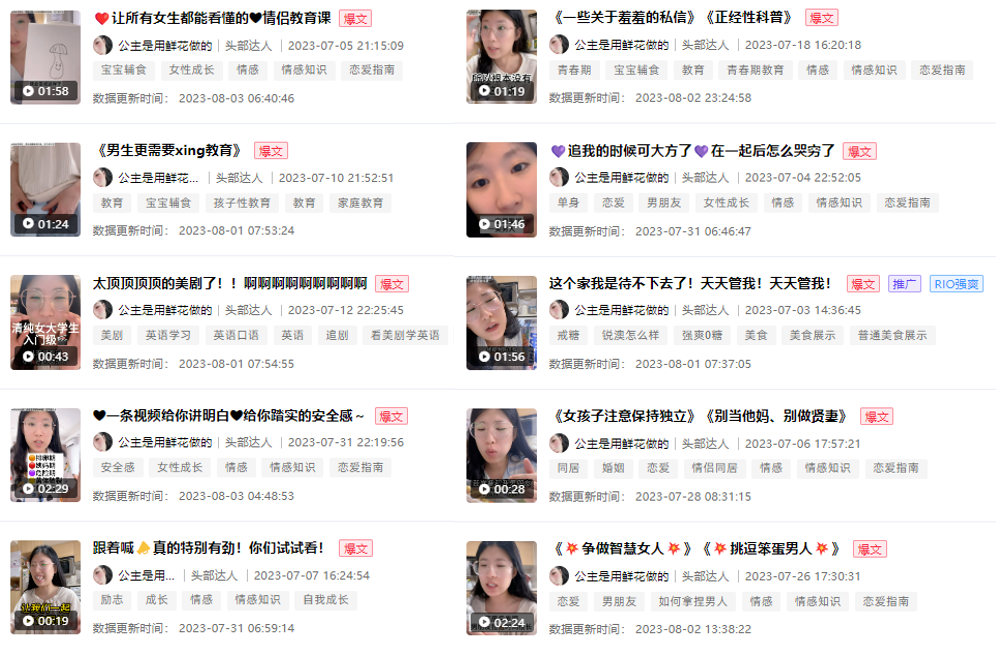 查看数据发现,该博主在7月的爆文率达到了96.15%,在选题方面涉及“清醒恋爱”、“嘴甜系列”、“两 / 性 / 科普”、“痴迷自己”、“恋爱技巧”等,聚焦账号定位的核心内容,同时当大家都在避讳性/科普话题的时候,这博主的选题却有不少于此相关的,这也为她的账号打造了一个丰满、立体的人设。