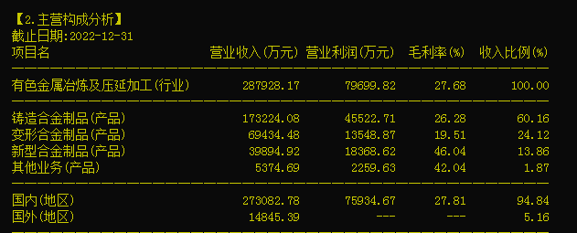 公司目前是国内高端和新型高温合金制品生产规模最大的企业之一,拥有年生产超千吨航空航天用高温合金母合金的能力以及航天发动机用精铸件的能力,在变形高温合金盘锻件和汽轮机叶片防护片等方面具有先进的生产技术,具有制造先进航空发动机亟需的粉末高温合金和 ODS 合金的生产技术和能力。