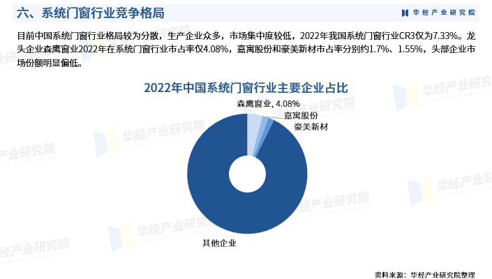 目前中国系统门窗行业格局较为分散,生产企业众多,市场集中度较低,2022年我国系统门窗行业CR3仅为7.33%。龙头企业森鹰窗业2022年在系统门窗行业市占率仅4.08%,嘉寓股份和豪美新材市占率分别约1.7%、1.55%,头部企业市场份额明显偏低。