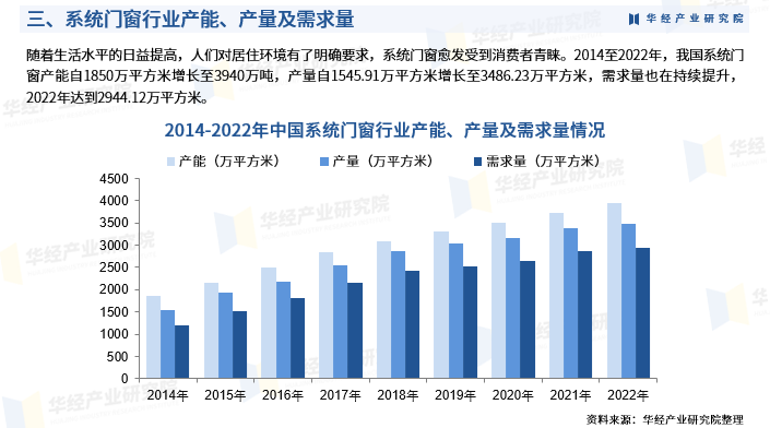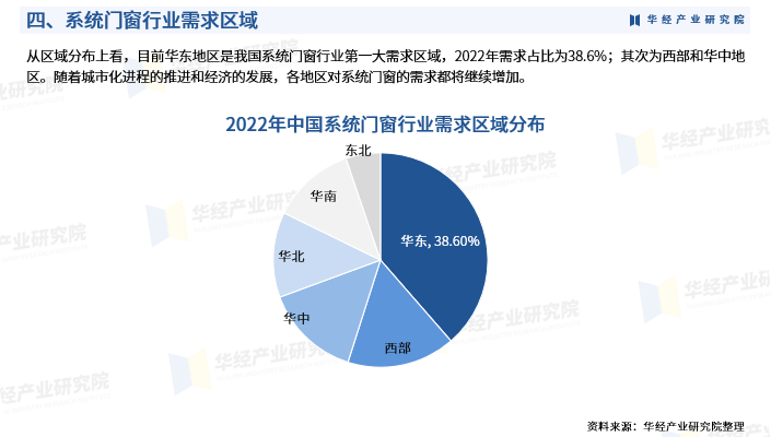 随着生活水平的日益提高,人们对居住环境有了明确要求,系统门窗愈发受到消费者青睐。2014至2022年,我国系统门窗产能自1850万平方米增长至3940万吨,产量自1545.91万平方米增长至3486.23万平方米,需求量也在持续提升,2022年达到2944.12万平方米。从区域分布上看,目前华东地区是我国系统门窗行业第一大需求区域,2022年需求占比为38.6%;其次为西部和华中地区。随着城市化进程的推进和经济的发展,各地区对系统门窗的需求都将继续增加。
