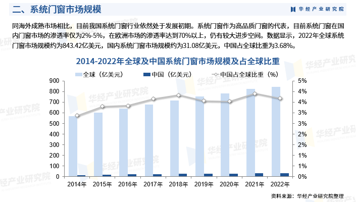 系统门窗是系统化设计、制造、安装的建筑门窗。相比传统门窗,系统门窗可在兼顾成本的前提下,保障高可靠性和耐用性,并实现多项优异性能。同海外成熟市场相比,目前我国系统门窗行业依然处于发展初期。系统门窗作为高品质门窗的代表,目前系统门窗在国内门窗市场的渗透率仅为2%-5%,在欧洲市场的渗透率达到70%以上,仍有较大进步空间。数据显示,2022年全球系统门窗市场规模约为843.42亿美元,国内系统门窗市场规模约为31.08亿美元,中国占全球比重为3.68%。