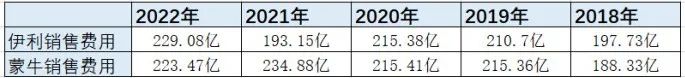 如果仅一年的数据并不具有代表性。拉长时间看,2022~2018年蒙牛的营收分别是伊利的75%、80%、78%、87%、86%;可以说蒙牛和伊利的体量差越来越大。但是蒙牛的销售费用却和伊利是一个体量上的投入,都在200多亿元。2021年和2019年两个财年竟一度超过伊利。结果导致——蒙牛近五年销售费用率均高于伊利。证明蒙牛在销售费用上投入比伊利大,却未能带动超过伊利的收入增长。通过数据背后我们得到:伊利的品牌效应优于蒙牛。对于消费者的粘性也优于蒙牛。