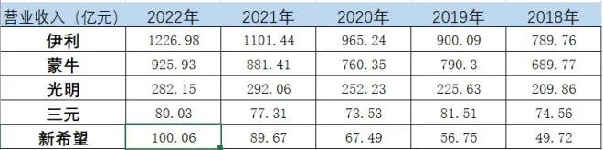 从伊利和蒙牛的费用和收入,不难看出,两家在销售费用的投入上基本是同一体量。2022年分别为229.08亿和223.47亿元。不禁让人感叹,两家企业真是财大气粗,同行业公司的营业收入尚且未达到如此规模。而它们仅用于营销相关的费用就达到了200多亿。伊利2022年的收入更是达到1226.98亿元,蒙牛收入为925.93亿元。伊利比蒙牛多出301亿,足足多出了一个光明乳业。更是远超像三元乳业、新希望等公司。别忘了,后者也是国内知名品牌。