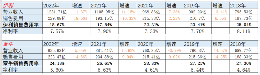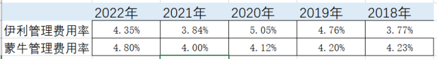 2022年,蒙牛和伊利两家的销售费用,合计花费就超过450亿元。所以在“有钱”方面两家巨头毋庸置疑。那么“花钱”的技术则通过对比他们历年的销售费用率、管理费用率,从中找到答案。