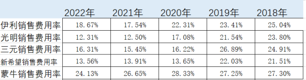 放眼整个乳制品行业前几名的情况。各家企业销售费用率都居高不下,基本都处在20%左右,这是整个行业特性决定的。虽然近三年由于疫情原因呈下降趋势,但疫情之后必然还是一片红海。