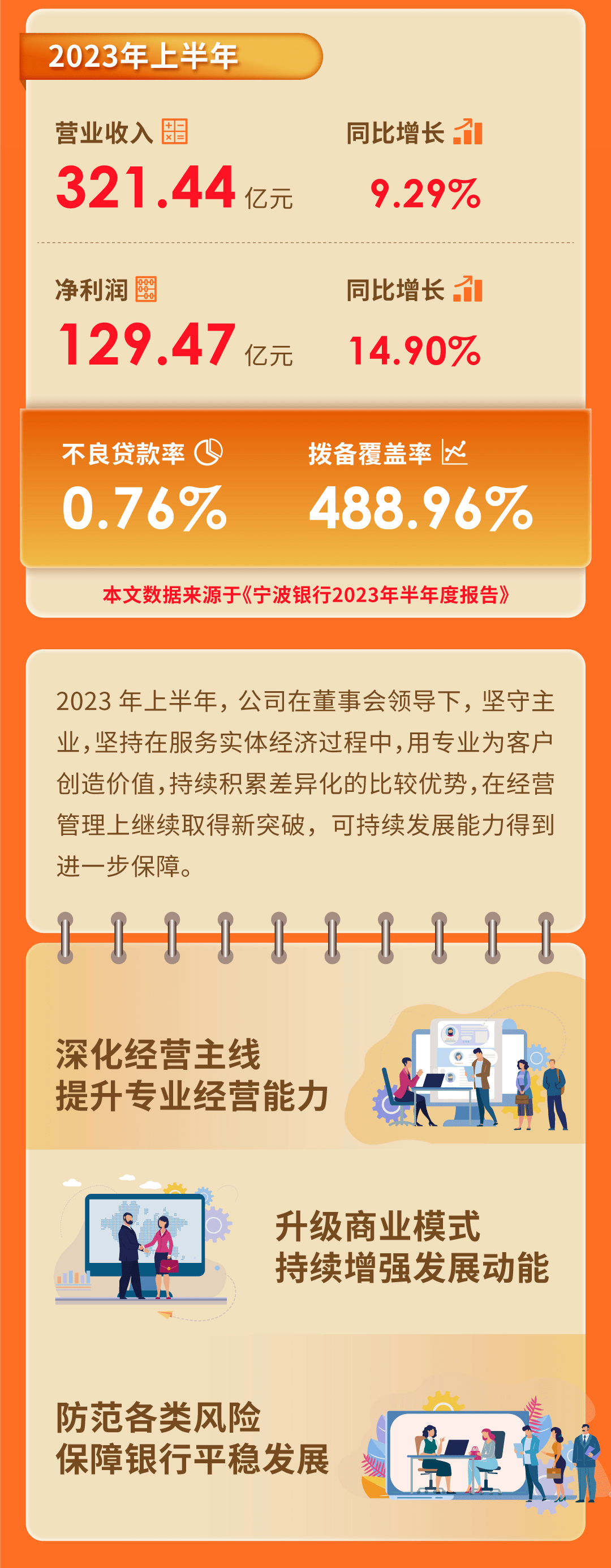 2023年上半年,宁波银行实现营业收入321.44亿元,同比增长9.29%;实现归属于母公司股东的净利润129.47亿元,同比增长14.90%。公司年化加权平均净资产收益率为16.15%,同比提升0.11个百分点,继续保持在行业较好水平。