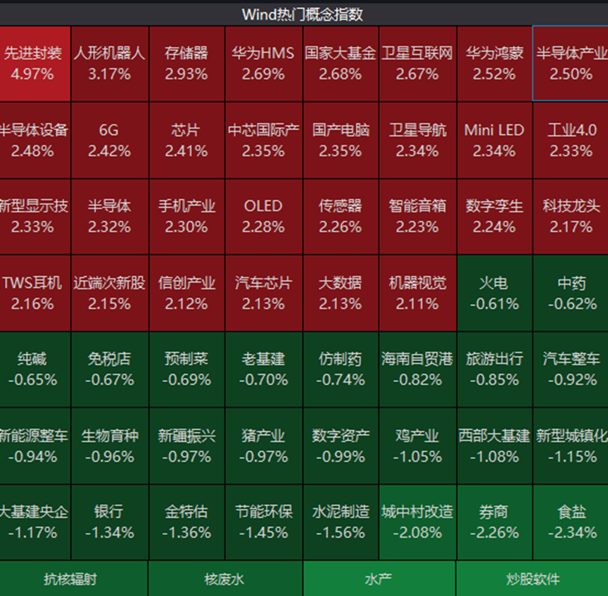 其次就是半导体芯片。半导体芯片的原因主要是华为公司全新的旗舰机突然上架销售,大家从旗舰机上发现了不少的亮点,叠加上前期芯片半导体板块的跌幅不小,因此大家会看到今天市场的芯片半导体相关板块引来了比较大的反弹。