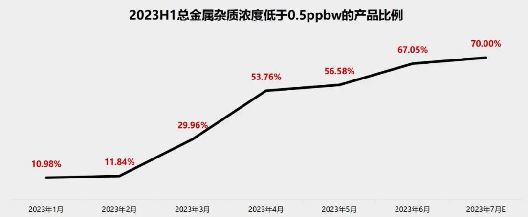 协鑫科技2022年财报中明确披露了总金属杂质浓度小于1ppbw产品的比例,提升显著。但2023年上半年公司直接王炸,索性披露出总金属杂质浓度小于0.5ppbw的产品比例提升曲线。参数指标直接收窄50%,可见其公司内部已经成熟把握对金属杂质的控制。