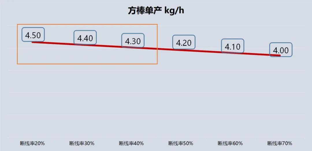 首先,正常情况下,方棒单产水平大概在4.5kg/h左右,断线率每增加10%,方棒单产大约会减少0.10kg/h,大致绘制出以下断线率与方棒单产的线性关系。断线率上升,并不是说就是用了颗粒硅或者块状硅,主要是取决于原料中的硅粉占比或者浊度大小。