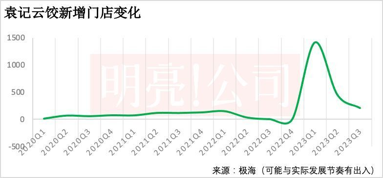 2020年一季度新增门店为10家,之后新增门店一直增加,2021年三季度,季度新增门店变成了115家,2021年四季度到2022年二季度,其新增门店分别为114家、125家和147家。2022年三季度掉下来变成了30家之后停止新增门店,半年之后的2023年一季度一口气开了1413家门店,直接等于原来速度新增门店的总数,同年的二季度和三季度也较之前有大幅增长,分别新增门店446家和206家门店。