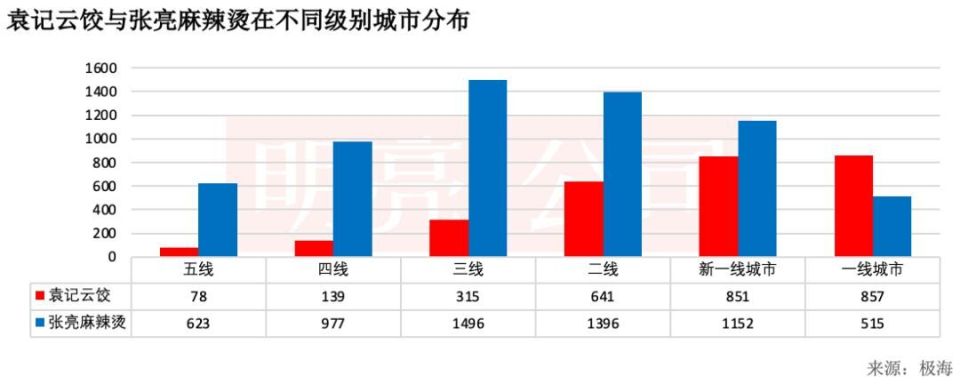 对比「张亮麻辣烫」,袁记云饺一线城市更多