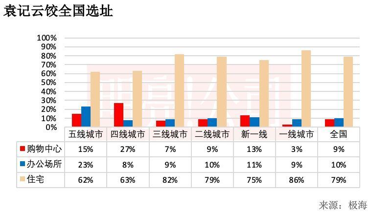全国范围内,袁记有79%的门店都开在住宅附近,分别只有10%和9%的门店会开在办公场所和购物中心。一线城市,开在小区的比例达到了86%,新一线城市小区店比例为75%。二线和三线城市在小区开店的比例分别为79%和82%,四线和五线城市小区店占比都在60%左右。和其他消费品牌一样,越到下沉,在购物中心的门店比例提升,袁记云饺也如此,在四线和五线城市,在购物中心门店的占比达到了27%和15%。