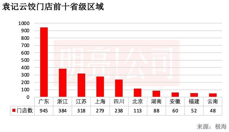 袁记云饺在广东起家,因而在广东有最多门店,目前有945家门店。在广东之外,浙江和江苏分别有384家和318家门店,门店数量前五的地区还包括上海和四川,分别有279家和238家门店。广东一个省的门店数差不多是浙江、江苏和上海门店的总和,可见袁记云饺在广东的门店密度之高。