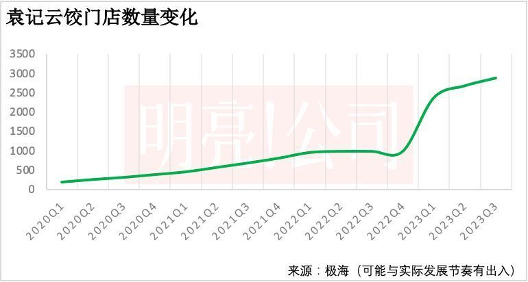 由于新增门店的增长,总门店趋势也是一直保持增长的。到2023年三季度(截止到8月),袁记云饺已经有2881家门店。极海数据显示,2020年一季度袁记云饺的总门店才193家,两年之后总门店数增长超10倍。