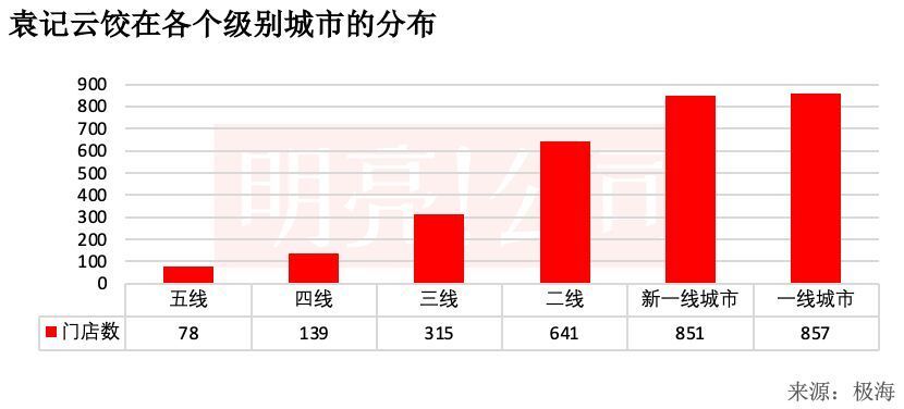 这一点在整体门店分布上也更明显。袁记云饺在一线城市中门店总共有857家,在一线城市中分布最多,其次是新一线城市,有851家门店,二线城市有641家门店。一线和新一线加起来就占了全国所有门店数的约50%。在三线、四线和五线城市分别有315家、139家和78家门店。