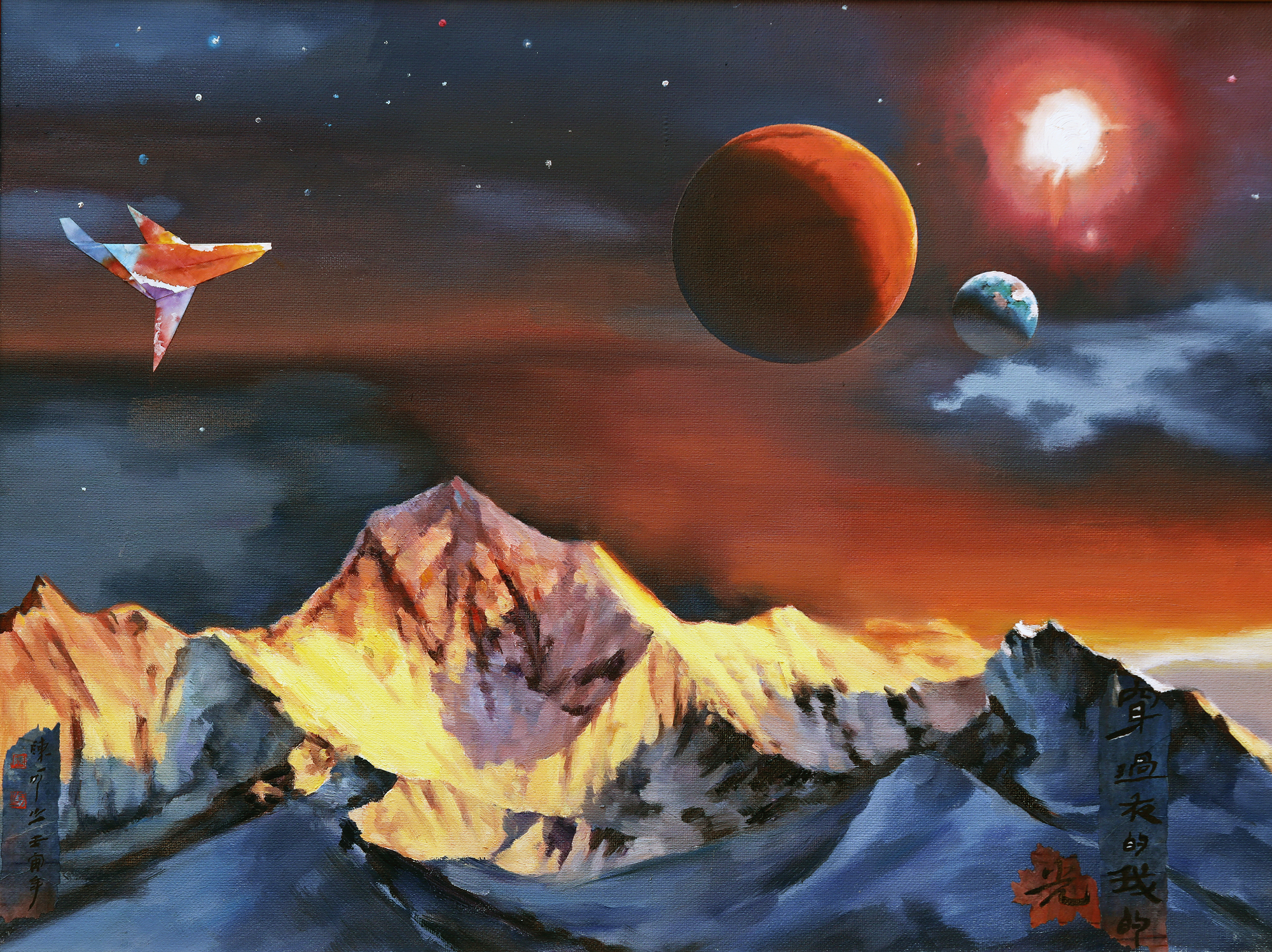 “疫情三年,国家和人民皆不易,就像身处黑夜,要见到光是很难的,但我们只要心里保持有光,就能穿过漫漫长夜,见到光明”,陈可之先生有感而发地说。以高山、星球、飞机、光照为意象,可之先生创作了油画《穿过夜的我的光》,描绘了人们在特殊时期,不惧黑夜,迎接光明,心中充满了爱和希望的场景。