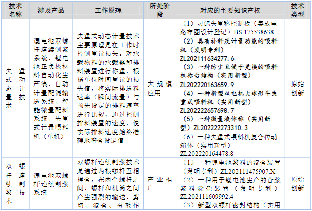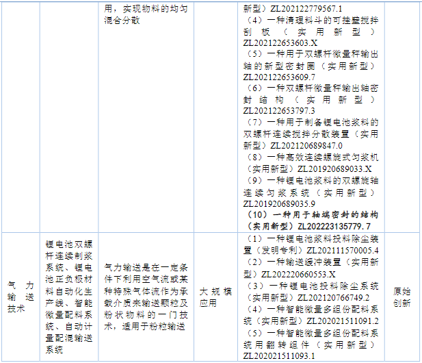 截至2023年6月30日,公司共取得专利权98项(其中发明专利6项),集成电路布图1项,计算机软件著作权16项,拥有数位行业资深专家,核心技术人员在螺杆式配混方面拥有30年的研发经验,较早将螺杆式连续制浆技术成功应用于锂电池行业。公司先后获评江苏省高新技术企业、江苏省服务型制造示范企业和示范培育企业、江苏省版权示范基地、国家级“专精特新”小巨人企业。