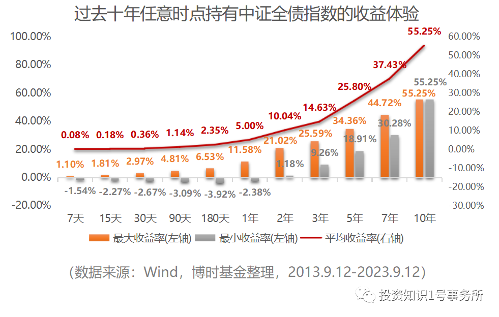 同样我们以过去十年持有中证全债指数为例。从收益体验上看,任意时点持有不同时长的中证全债指数,平均收益率随着持有时长的增加而同步上行。