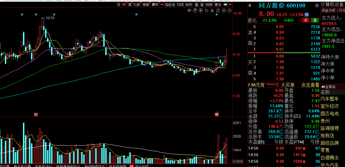同方股份在早盘是一个比较好的倒车接人的上车机会,近期的量价关系也是比较配合,上涨放量,下跌缩量,现在依然还是在圆弧底的上升通道之中,中期依然还是有继续冲高走强的机会,可以持续的关注。