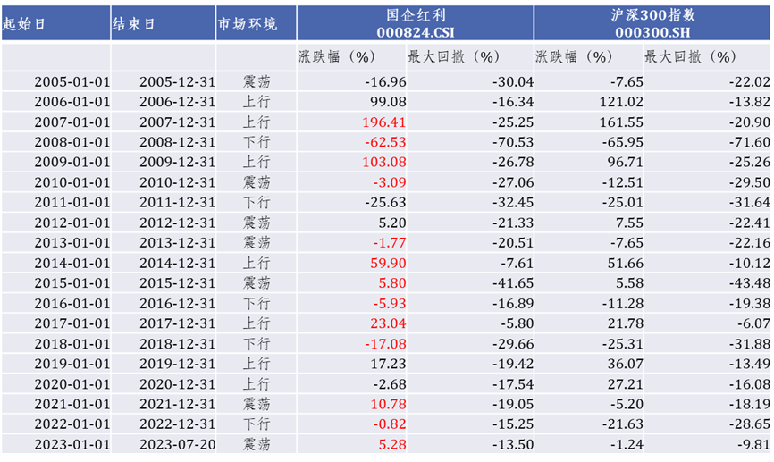 市场下行期/震荡期红利策略防御属性凸显。国企红利指数在过去19年中有13年跑赢沪深300指数,且红利策略在市场震荡下行阶段相对较强的抵御风险能力。