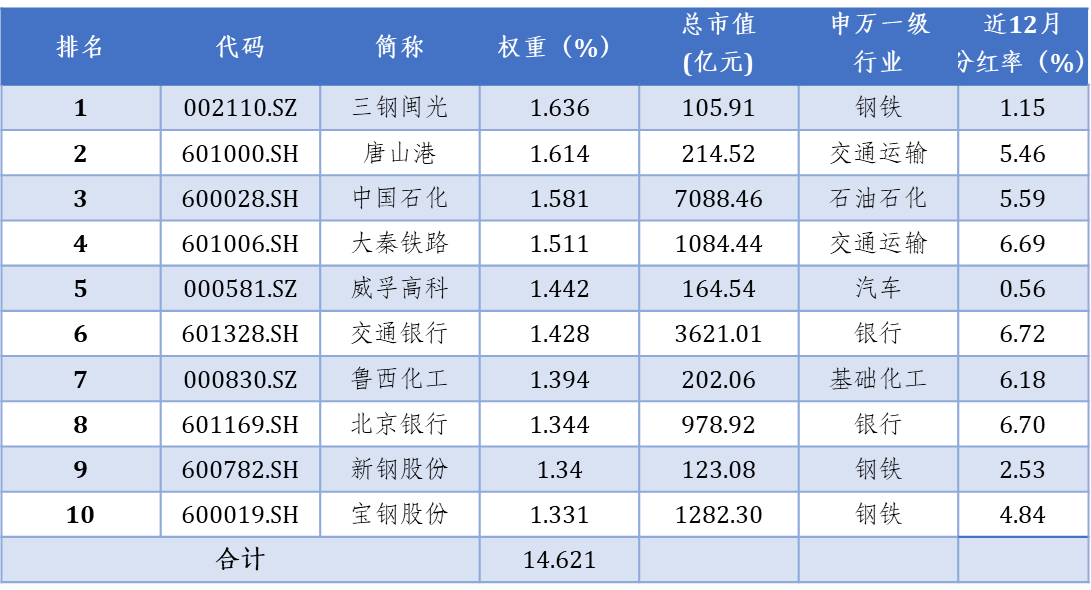 前十大成分股的总权重为14.6%,包括中国石化、交通银行、宝钢股份、大秦铁路等传统周期行业行业、金融龙头公司,分红率突出