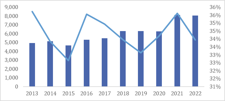 国有经济是我国经济与社会稳定的压舱石,在关系国家安全与国民经济的主要领域中具有的重要支柱的地位。2022年国有企业营业总收入达53.49万亿元,占当年GDP总额121万亿元的44%。
