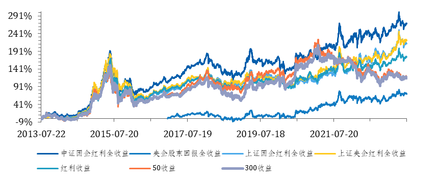 过去十年,中证国企红利全收益指数的累计收益率达到271.6%,显著高于同期的上证50全收益、沪深300全收益、红利收益及同类央/国企红利全收益指数。