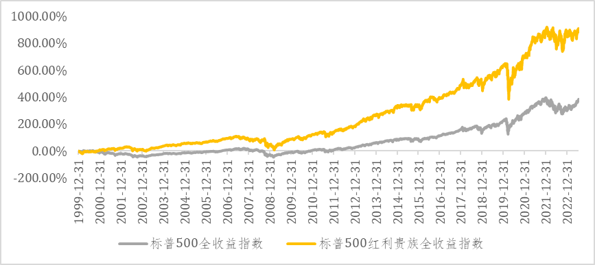 从海外成熟市场来看,红利策略长期表现优异。从长期投资的角度来看,红利回报在总回报中占据重要地位。标普 500 红利贵族指数(S&P High Yield Dividend Aristocrats)是追踪过去 25 年每年持续增加红利发放的标普 500 成分公司的指数,从下图中可以看到,标普 500 红利贵族指数显著跑赢了同期标普500 指数。