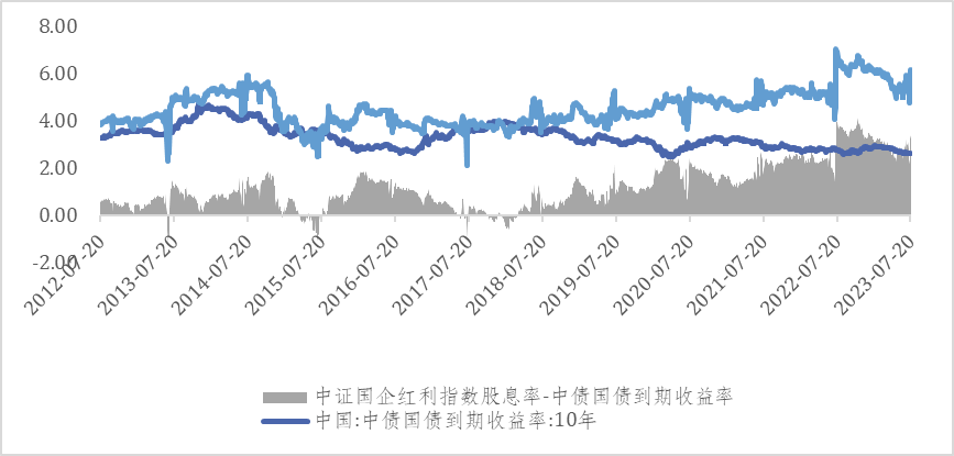 图:中证国企红利指数股息率(%)与 10 年期国债收益率(%)对比