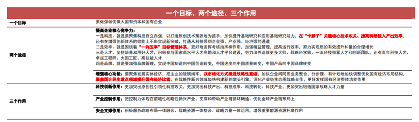 坚持“一个目标”、用好“两个途径”、发挥“三个作用”,助力实现中国式现代化。2023年2月23日,新任国资委主任张玉卓在国新办“权威部门话开局”系列主题新闻发布会上首次亮相,表示未来国有企业要坚持“一个目标”、用好“两个途径”、发挥“三个作用”我们预计未来国有企业改革将更加聚焦“两个用途”,即提高核心竞争力和增强核心功能,具体来看可能包括加大技术投入规模、提升管理效率、推进市场化战略重组等多个方面