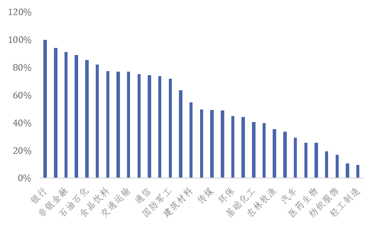 国有企业主要分布在关系国家安全和国民经济命脉的重要行业和关键领域,包括机械设备、基础化工、交通运输、公用事业、建筑装饰等行业,在产业链当中偏中上游。国有企业在煤炭、公用事业、石油石化与建筑装饰等行业占据主导地位,市值占所在行业市值比重超过了80%。