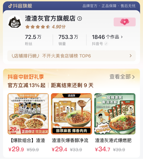 这其中,主打“吃”的“渣渣灰”速食食品创立于2020年底,主营产品为速食米粉。我们可以看到,在抖音平台上,截至目前渣渣辉官方店已经拥有72.5万粉丝,累计销量达735.3万份。招股书显示,按照商品交易总额计算,“渣渣灰”还是速食食品行业中增长最快的品牌之一。