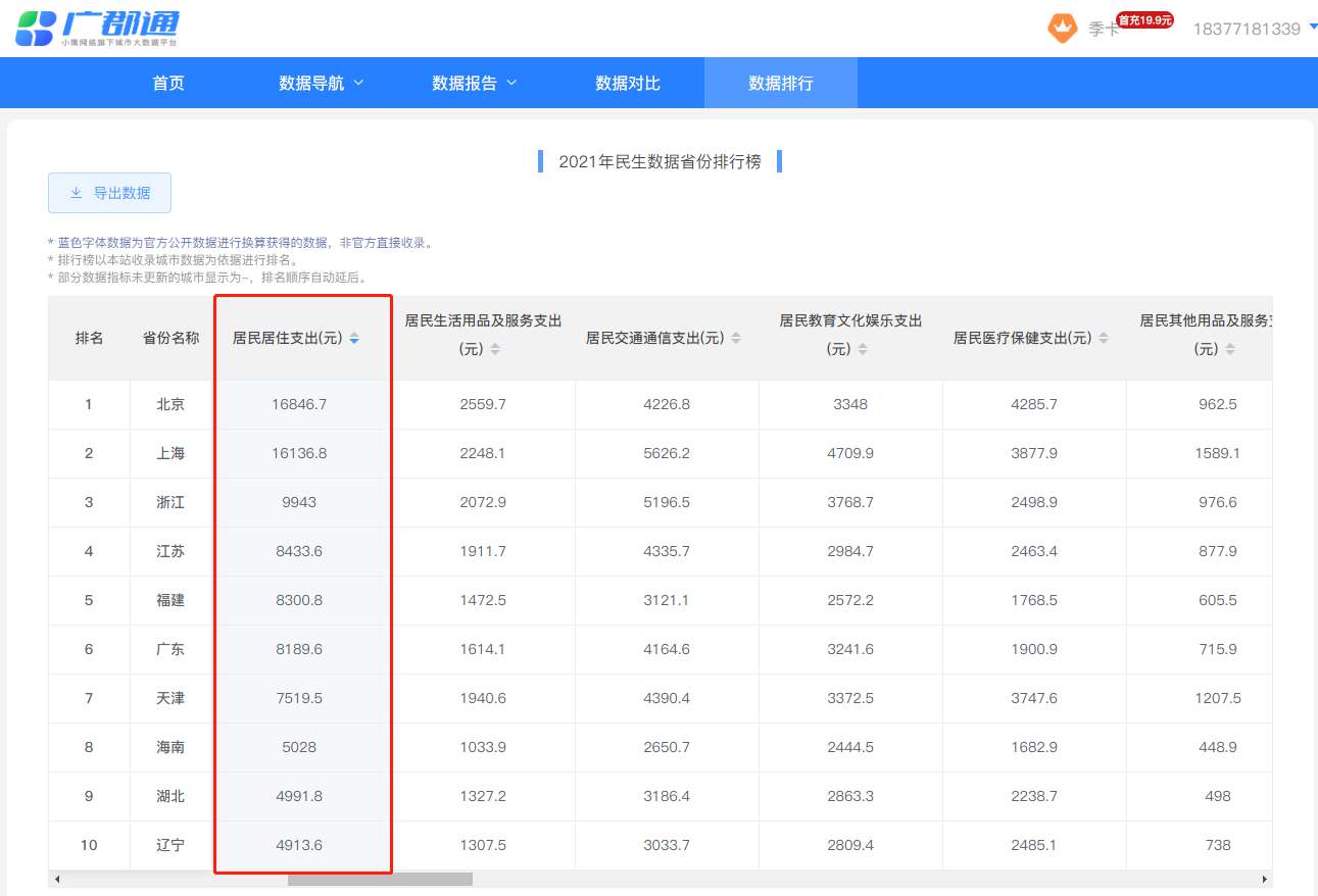 在现代经济生活中,城市居民的居住支出成为了衡量一个城市经济发展与居民生活质量的重要指标。广郡通数据平台近期公布的一组数据显示,不同省份的居住支出差异较大,其中北京、上海、浙江位列前三,而湖北、辽宁等省份的居住支出相对较低。