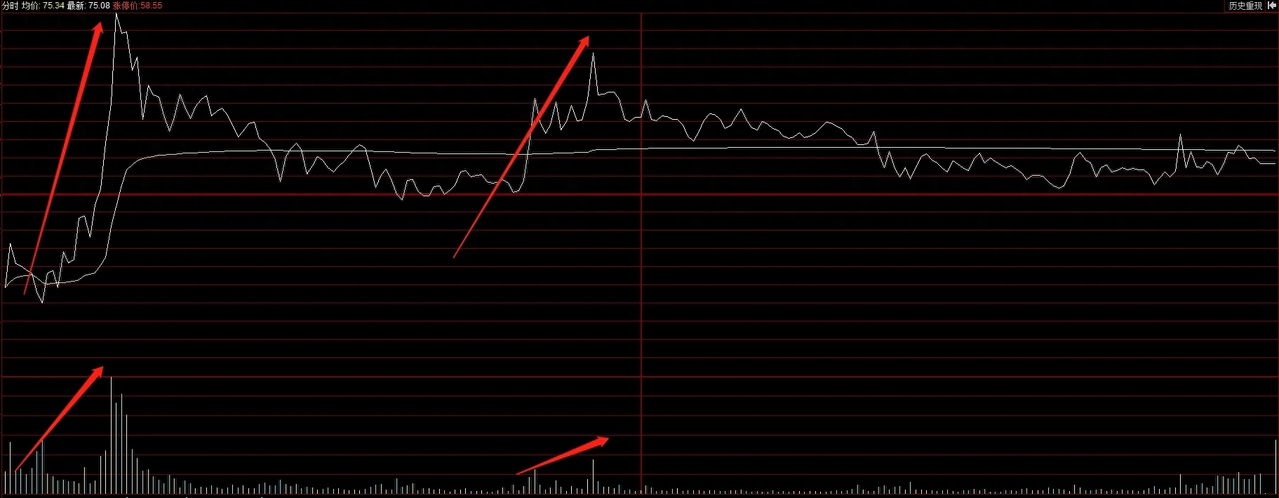 一、突放大量跳跃拉升冲板,但后面量能迅速缩小。这种现象不要去追,因为主力不坚决,购买持续性差,难形成合力!往往摸一下板然后迅速打开,形成长上影概率极大。