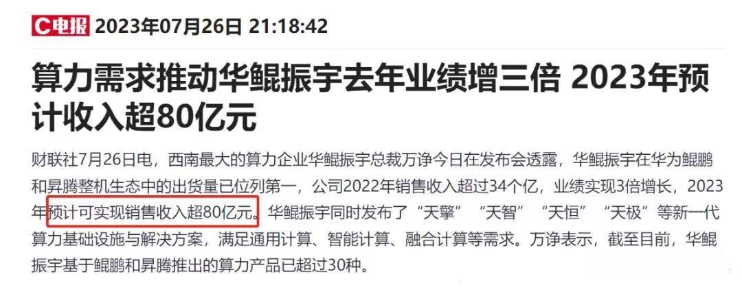 算力需求推动华鲲振宇去年业绩爆增三倍,2023年预计收入超80亿元,打通AI应用最后一公里。