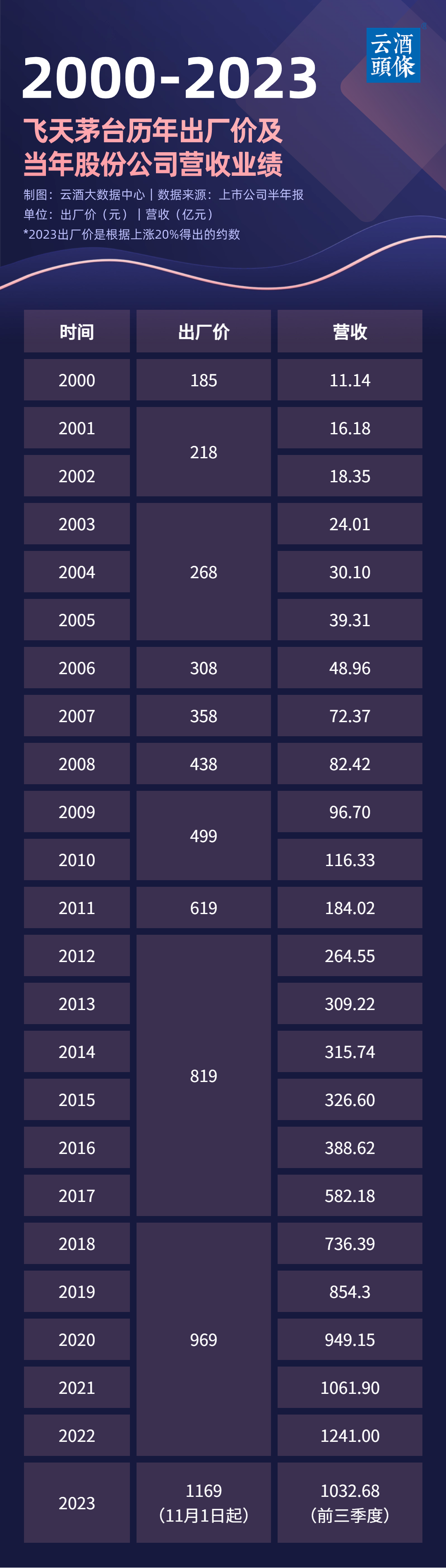 这是自2018年元旦以来,飞天53%vol 500mL贵州茅台酒出厂价格维持969元近6年后作出的调整,根据约20%的提价幅度,上调约200元/瓶,本次调整后出厂价格约1169元/瓶。