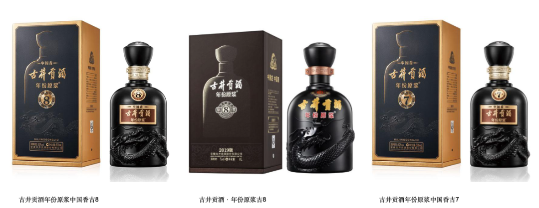 古井贡酒主打产品就是“年份原浆”系列酒,这一系列产品占古井贡酒总营收比例高,是毫无疑问的主力产品。官网显示,古井贡酒年份原浆系列包含“年份原浆古5”“年份原浆古7”“年份原浆古8”“年份原浆古20”“年份原浆古16”“年份原浆古26”等多个单品。