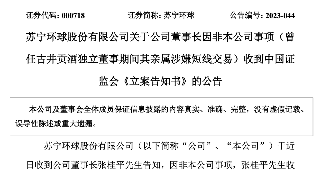 10月21日,苏宁环球发布公告,公司于近日收到公司董事长张桂平先生告知,因非本公司事项,张桂平先生收到中国证券监督管理委员会(以下简称“中国证监会”)安徽监管局送达的《立案告知书》(证监立案字 0232023004 号),内容为:“因张桂平先生在担任安徽古井贡酒股份有限公司(以下简称,古井贡酒)独立董事期间,其配偶买卖古井贡酒股票导致涉嫌短线交易,中国证监会决定对其立案。”