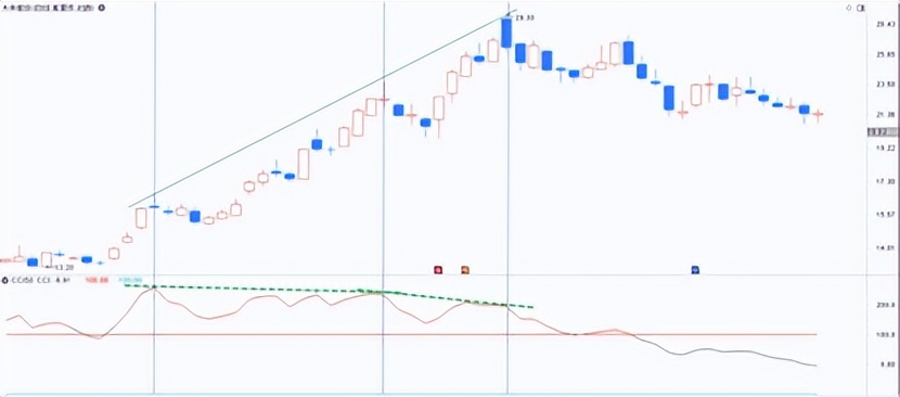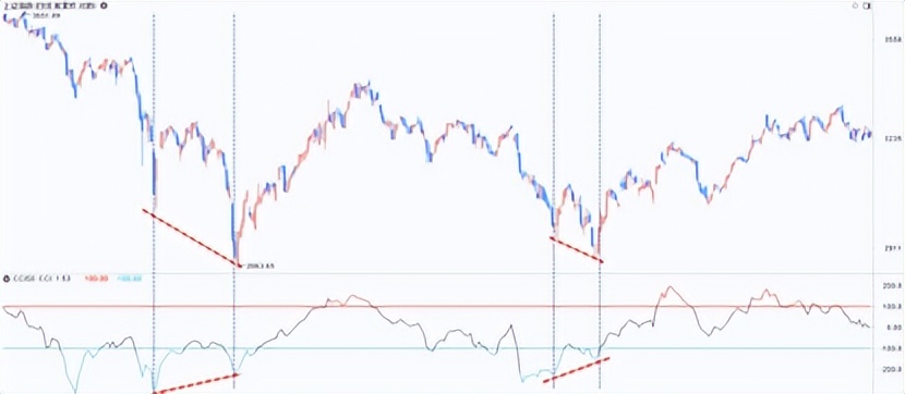 这是我们要介绍的CCI最后一种用法。和CCI的具体读数无关,通过阅读指标线的背离现象来找寻转折点。
