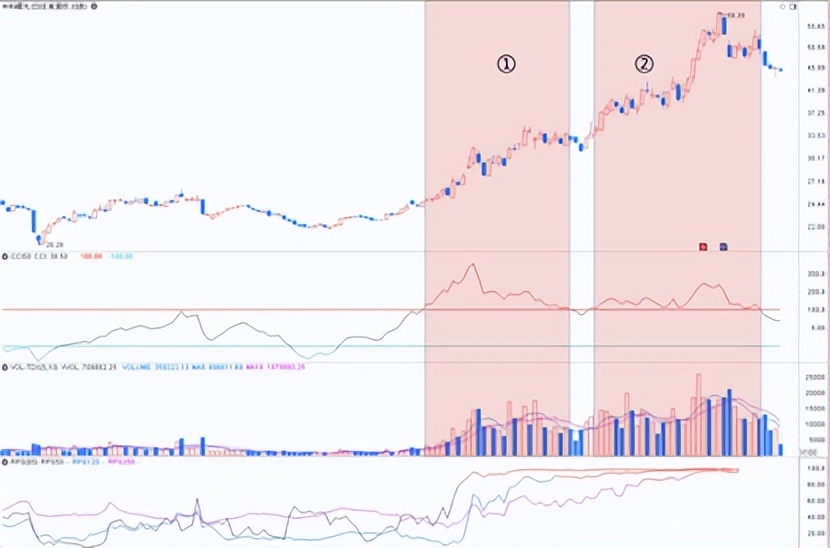 图例:中科曙光即是中字头,也有信息安全/国产软件概念。在区域,CCI强势上穿+100,量价配合良好,但RPS尚未迅速提升。但很快就迎来第二波交易机会(区域),在35个交易日里可以斩获约40%的收益。