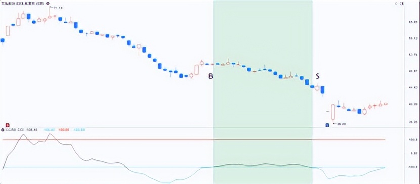在将CCI当作摆动指标使用时,如果进场后指标线再度下破-100,是需要离场的——和向上突破的原理一样,你要谨防价格加速下跌。