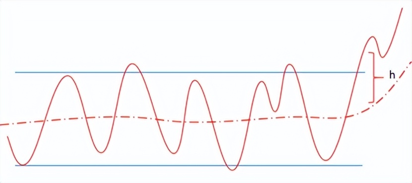 假设下图红色曲线是股价,虚线是均线,原本价格在震荡区间运行,现在放量加速突破(A点),那么当前K线距离均线一定是偏离更远,CCI会大幅走高,这同时也是一个标准突破买点。