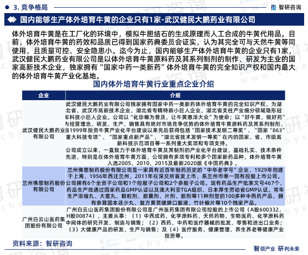 体外培育牛黄是在工厂化的环境中,模拟牛胆结石的生成原理而人工合成的牛黄代用品。目前,体外培育牛黄的药效和品质已得到国家药典委员会证实,认为其完全可与天然牛黄等同使用,且质量可控、安全隐患小。迄今为止,国内能够生产体外培育牛黄的企业只有1家,武汉健民大鹏药业有限公司是以体外培育牛黄原料药及其系列制剂的制作、研发为主业的国家高新技术企业,独家拥有“国家中药一类新药”体外培育牛黄的完全知识产权和国内最大的体外培育牛黄产业化基地。