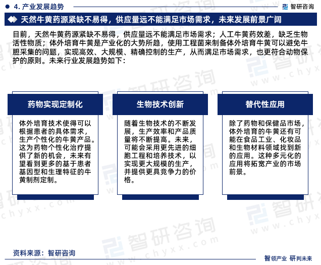 1、药物实现定制化。体外培育技术使得可以根据患者的具体需求,生产个性化的牛黄产品。这为药物个性化治疗提供了新的机会,未来有望看到更多的基于患者基因型和生理特征的牛黄制剂定制。