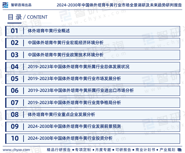 《2024-2030年中国体外培育牛黄行业市场全景调研及未来趋势研判报告》是智研咨询重要成果,是智研咨询引领行业变革、寄情行业、践行使命的有力体现,更是体外培育牛黄领域从业者把脉行业不可或缺的重要工具。智研咨询已经形成一套完整、立体的智库体系,多年来服务政府、企业、金融机构等,提供科技、咨询、教育、生态、资本等服务。