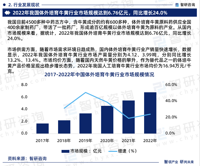 我国目前4500多种中药古方中,含牛黄成分的约有600多种,体外培育牛黄原料药供应全国400余家制药厂,带活了一批药厂,形成逾百亿规模以体外培育牛黄为原料的产业。从国内市场规模来看,据统计,2022年我国体外培育牛黄行业市场规模达到6.76亿元,同比增长24.0%。