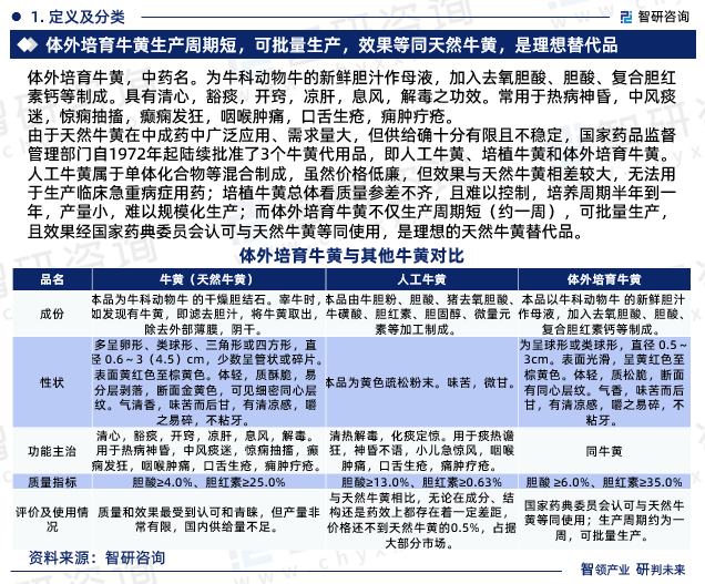 由于天然牛黄在中成药中广泛应用、需求量大,但供给确十分有限且不稳定,国家药品监督管理部门自1972年起陆续批准了3个牛黄代用品,即人工牛黄、培植牛黄和体外培育牛黄。人工牛黄属于单体化合物等混合制成,虽然价格低廉,但效果与天然牛黄相差较大,无法用于生产临床急重病症用药;培植牛黄总体看质量参差不齐,且难以控制,培养周期半年到一年,产量小,难以规模化生产;而体外培育牛黄不仅生产周期短(约一周),可批量生产,且效果经国家药典委员会认可与天然牛黄等同使用,是理想的天然牛黄替代品。